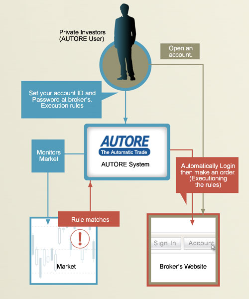 Autore user create an execution rule first and set brokerage account information. When everything is ready, Autore System begins monitor market. When the execution rule matches, Autore System automatically logs into broker's website with the account information and will make an order. Autore System behaves exactly the rule you created.